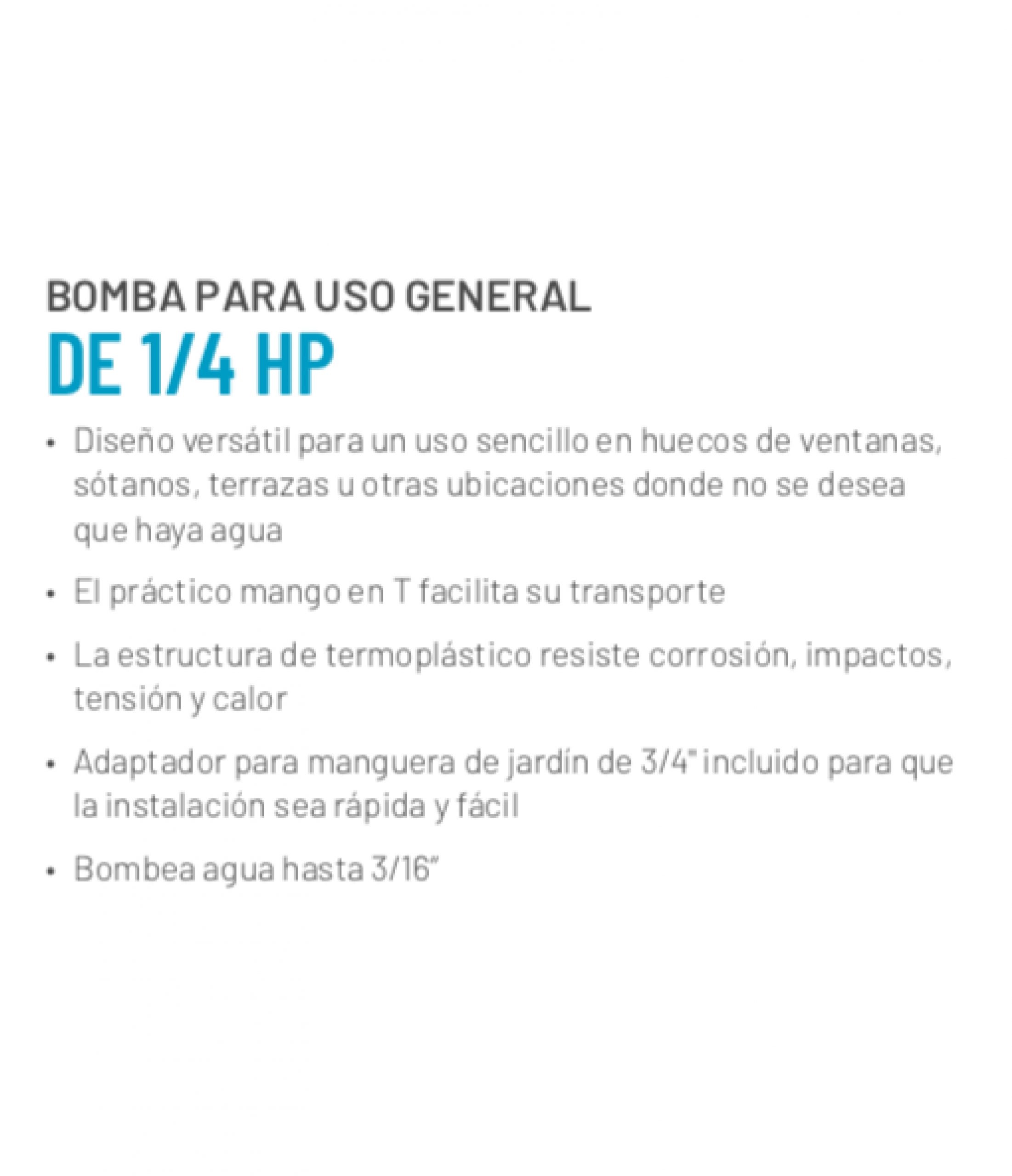 Electrobomba sumergible aguas limpias, especial y practica para dejar la menor lamina de agua en la superficie.